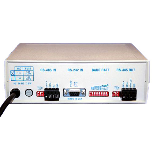 The A1000 series isolated RS-232 to RS-485 serial communication converters will convert RS-232 signals to the correct electrical signal levels required by RS-485 devices. RS-485 is recommended in applications where many DGH modules, or other addressable devices, must be connected to a host computer and communicate over a long distance. The A1000 will allow communications bus lengths up to 4,000 feet using baud rates up to 115.2K baud on one twisted pair of wires.