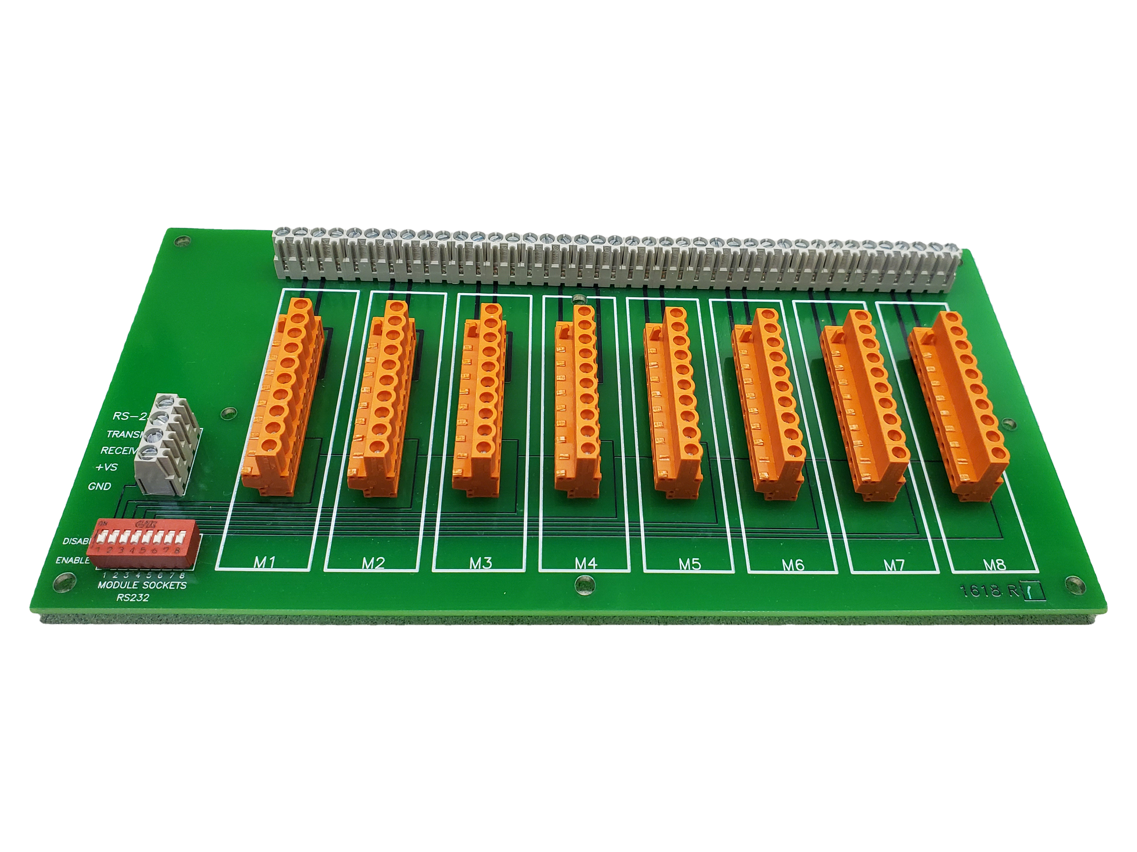 The BP-8 mounting backplane simplifies the mounting of multiple RS-485 modules in a single location. The backplane reduces wiring costs by making all the common power supply and communications connections on the backplane. Screw terminals are provided to interface sensor connections, the power supply and communications signals. The backplanes include thru-hole stand offs for mounting, a module hold-down bar, and holes for an RS-485 termination resistor.