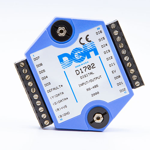 The D1701 and D1702 digital I/O modules contain seven discrete digital inputs, eight digital outputs and communicate using either RS-232 or RS-485.  The digital outputs can be used to control solid-state relays and annunciators.  They can be pulled up to +30Vdc and sink up to 30mA with out damage.  The discrete digital inputs can accept +/-30Vdc signals without damage.  The discrete switching levels are <+1Vdc = logic “0”, >+3.5Vdc equals a Logic “1”.