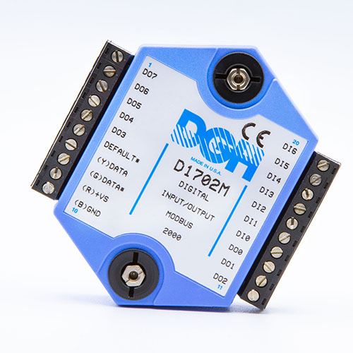 The D1701M and D1702M digital I/O modules contain seven discrete digital inputs and eight open-collector digital outputs for applications that require additional digital I/O capacity. The D1701M and D1702M communicate using the Modbus RTU serial protocol
