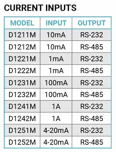 The D1200M current input modules contain an isolated 15-bit analog to digital converter and measure DC current with full scale input ranges from +/-1mA to +/-1Amp, including 4-20mA. Each module is hardware optimized for the best measurement performance over the full-scale input range. Five different current input ranges are available.