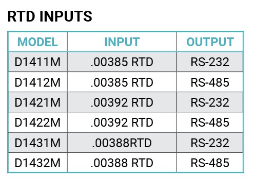 The D1400M modules measure RTD (Resistance Temperature Detector) sensors. RTD sensors are resistors that have a very predictable change in resistance vs temperature. They are available in 2-wire, 3-wire and 4-wire versions. The D1400M contains four sensor input terminals and will accept any of the three different wiring methods. One of the four terminals is an excitation current output signal for the sensor.