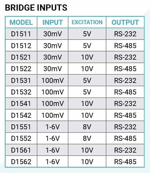 The D1500 bridge and load cell input modules include one open-collector digital output that can be used to control solid-state relays and annunciators or be programmed as a LO alarm output based on the sensor input value. They can be pulled up to +30Vdc and sink up to 30mA without damage.