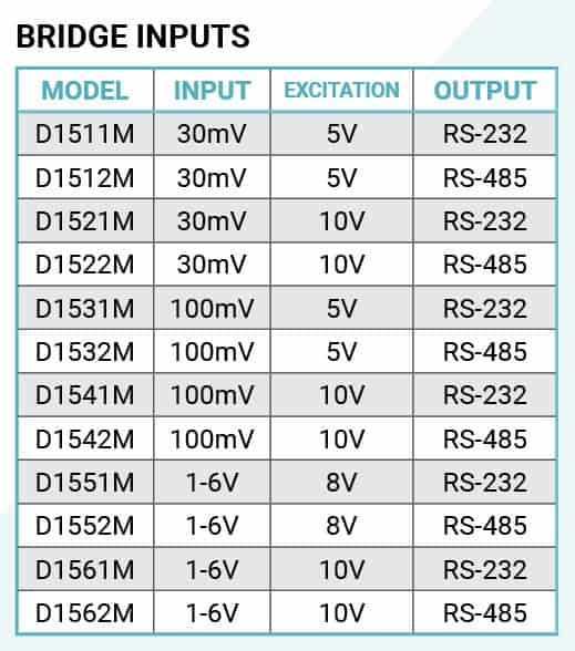 The D1500M bridge and load cell input modules contain an isolated 15-bit analog to digital converter for measuring sensors with a resistive bridge output. Each module includes an isolated excitation voltage source for exciting the sensor. The onboard excitation allows the module to compensate for changes in ambient temperature during the measurement process. Measurement ranges include +/-30mV, +/-100mV, and 1-6Vdc. Available excitation voltages include 5V, 8V and 10Vdc, 60mA max current output.