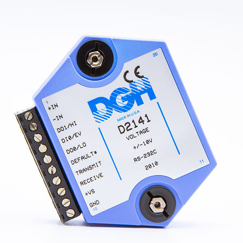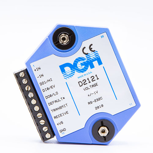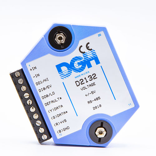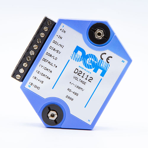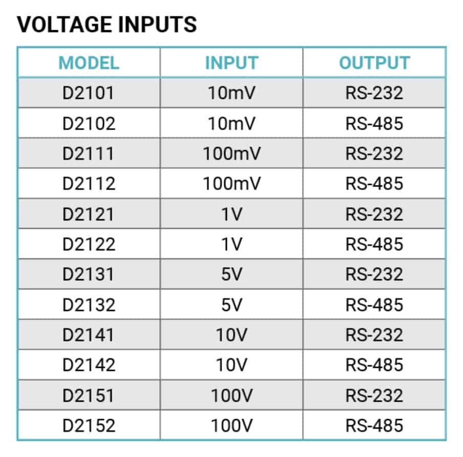 The D2100 programmable voltage input modules measure DC voltages with full scale input ranges from +/-10mV to +/-100Vdc. The voltage input modules provide an isolated 15-bit measurement, analog to digital conversion and a linearized data output scaled into engineering units. The scaled data is communicated using either RS-232 or RS-485.