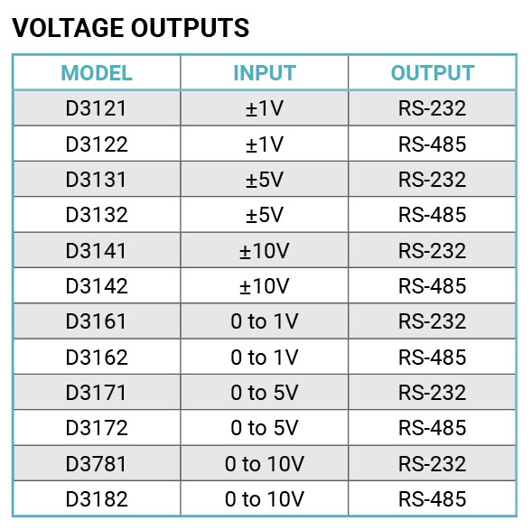 The D3100 series voltage output modules contain an isolated 12-bit digital to analog converter that is scaled to generate DC voltages commonly used in the process control, production test and motion control industries. Six different voltage output ranges are available. Simple ASCII character commands are used to control the 12-bit digital to analog converter. The commands are received from a host computer through either an RS-232 or RS-485 serial port.