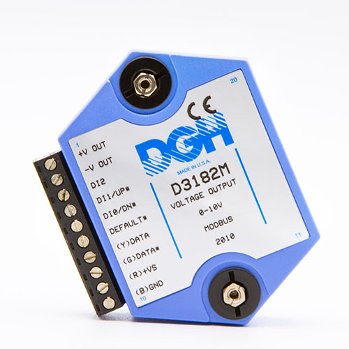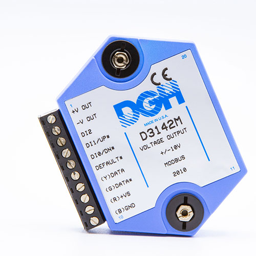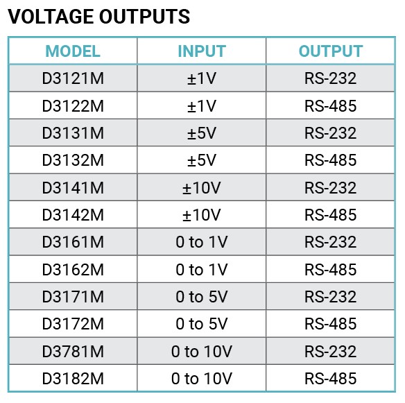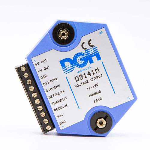 The D3100M series voltage output modules contain an isolated 12-bit digital to analog converter that is scaled to generate DC voltages commonly used in the process control, production test and motion control industries. Six different voltage output ranges are available.