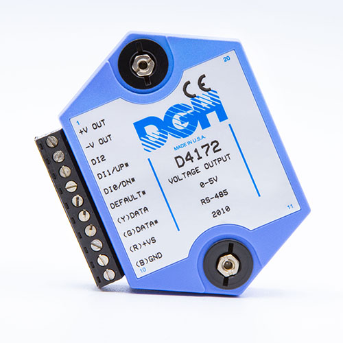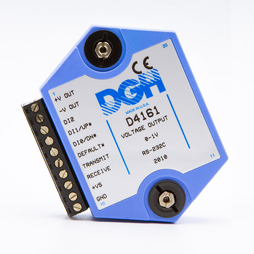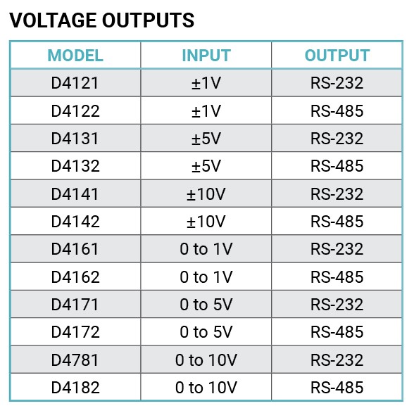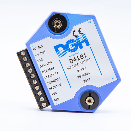 The D4100 series analog output modules contain an isolated 12-bit digital to analog converter that is scaled to generate DC voltage signals commonly used in the process control, production test and motion control industries. Six voltage output ranges are available. Simple commands are used to control the 12-bit digital to analog converter through either an RS-232 or RS-485 serial port.