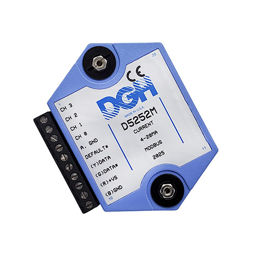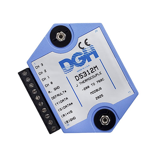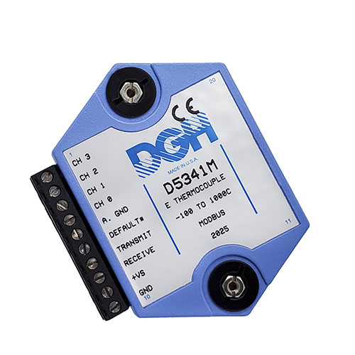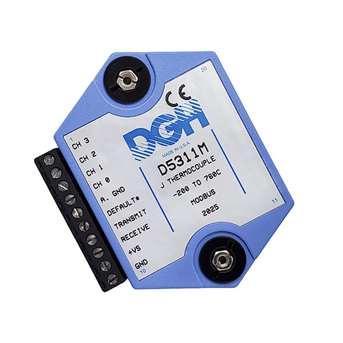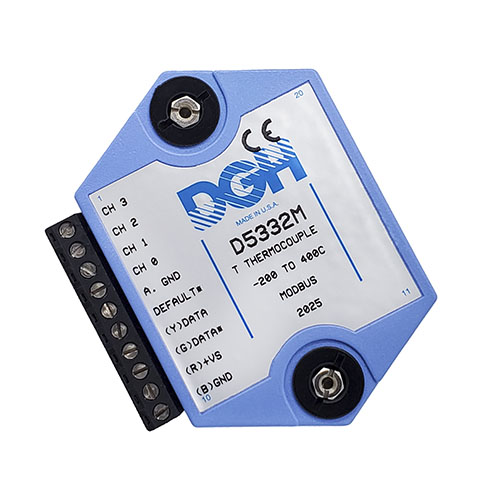 The D5000M Modbus analog input modules provide direct connection to four analog signals of the same input type. The modules can measure DC voltages, 4-20mA, thermocouples and thermistors. Each module performs the analog to digital conversion, linearization and scaling into Modbus 16-bit unsigned integer digital data values.
