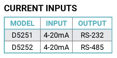 The 4-20mA input modules provide an isolated 15-bit measurement, analog to digital conversion and a linearized data output scaled into engineering units. The scaled data is communicated using either RS-232 or RS-485.