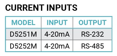The D5200M Modbus four channel 4-20mA current input modules provide direct connection to four 4-20mA signals with full scale input range of 0-25mA.