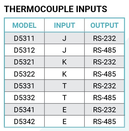 The D5300 four channel thermocouple input modules measure four different thermocouple types including J, K, T, E types. The thermocouple input modules provide an isolated 15-bit measurement, analog to digital conversion and a linearized data output scaled in user-selectable degrees C or F values. The scaled data is communicated using either RS-232 or RS-485.