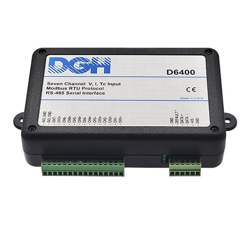 The D6400 analog input module contains seven differential inputs for measuring DC voltages, current signals such as 4-20mA and thermocouple temperature sensors. Each input channel can be configured to measure one of six voltage ranges, eight thermocouple types or a current input such as 4-20mA.