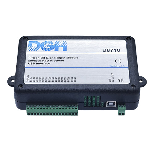 The D8710 Modbus digital input module contains fifteen isolated digital inputs for sensing contact closures or other on/off signals. The inputs can be read individually or all at once using the Modbus RTU serial protocol.