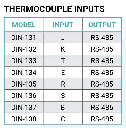 The DIN-130 thermocouple input modules contain an isolated 15-bit analog to digital converter and measure thermocouple temperature sensors. Each module is hardware optimized for the best measurement performance over a thermocouple input range. Eight different thermocouple input ranges are available.