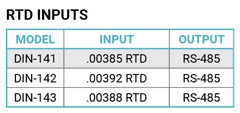 The DIN-140 RTD input modules contain an isolated 15-bit analog to digital converter and measure RTD temperature sensors. Each module is hardware optimized for the best measurement performance over the sensor input range. Three different RTD input modules are available, .00385, .00388 and .00392.
